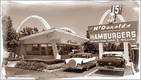 The original red and white tiled restaurant building featuring the Golden Arches underwent several remodels throughout the years and was finally torn down in 1984.