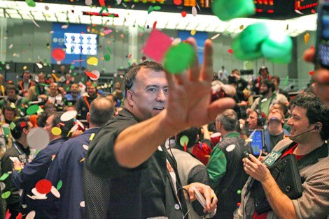 Traders in the Eurodollar options pit during the last day of 2010 trading on the floor of the CME Group's Chicago Board of Trade in Chicago on Friday, Dec. 31, 2010. It is tradition that traders, clerks and other floor workers throw confetti amongst themselves to celebrate the end of the trading year as other traders may still work through the festivities.